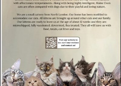 Just received our beautiful Maine coon kitten. We’re in love! Couldn’t recommend highly enough. A caring and professional service throughout the process. Excellent support and absolutely gorgeous kitten. Thank you! Our hearts are full.