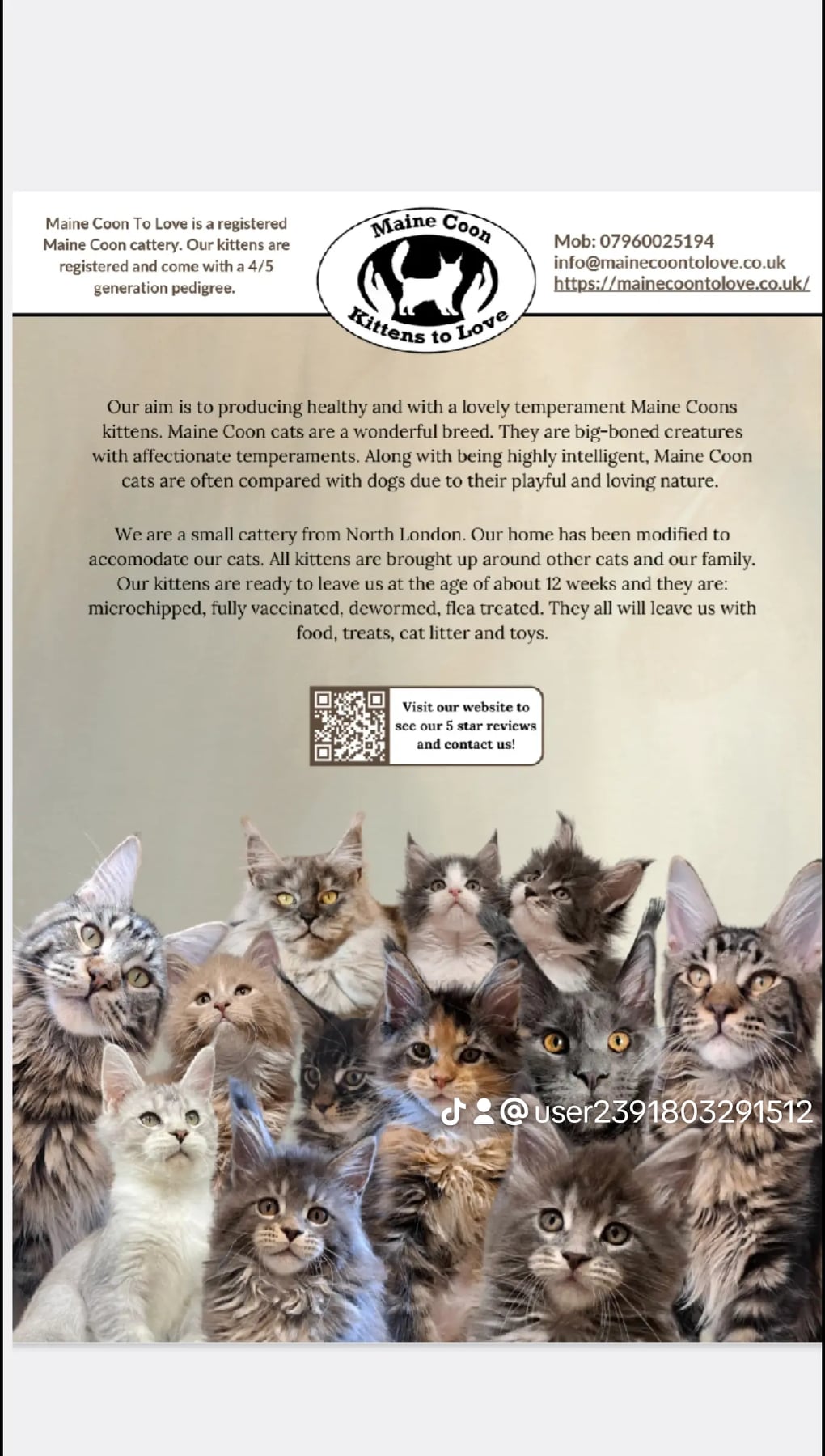 If your looking to buy a mainecoon cat I strongly recommend looking at website mainecoontolove.co.uk. professional breeder, lovely lady. Very happy with kitten I've bought. Intend to buy another one from same breeder 10 out of ten